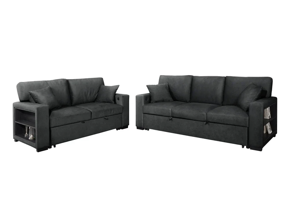 Features: Bookcase on Both Arms, 4 Pillows (Sofa & Loveseat), USB & Type C port on each Arms, Drop Down Table with Cupholders (Sofa) and Pull Out Sleeper.