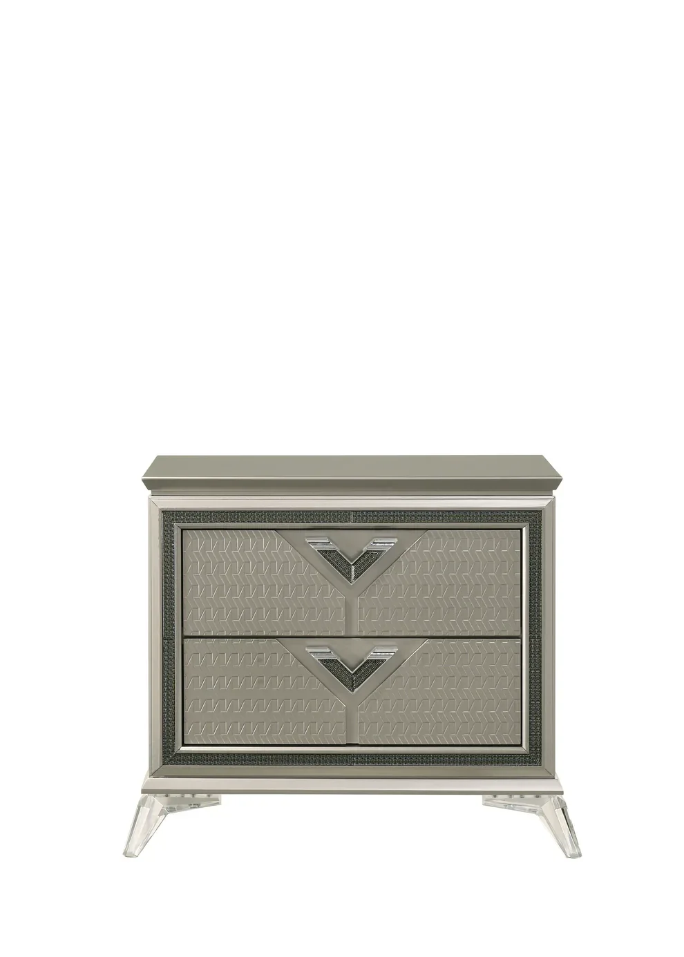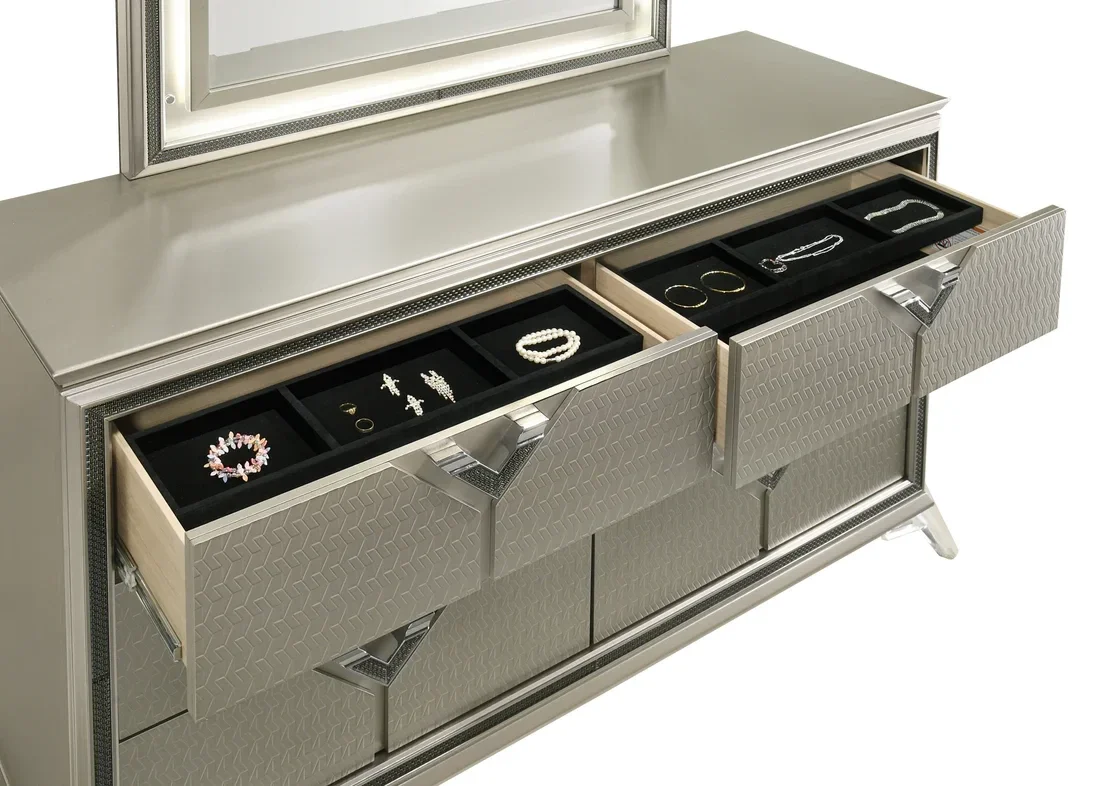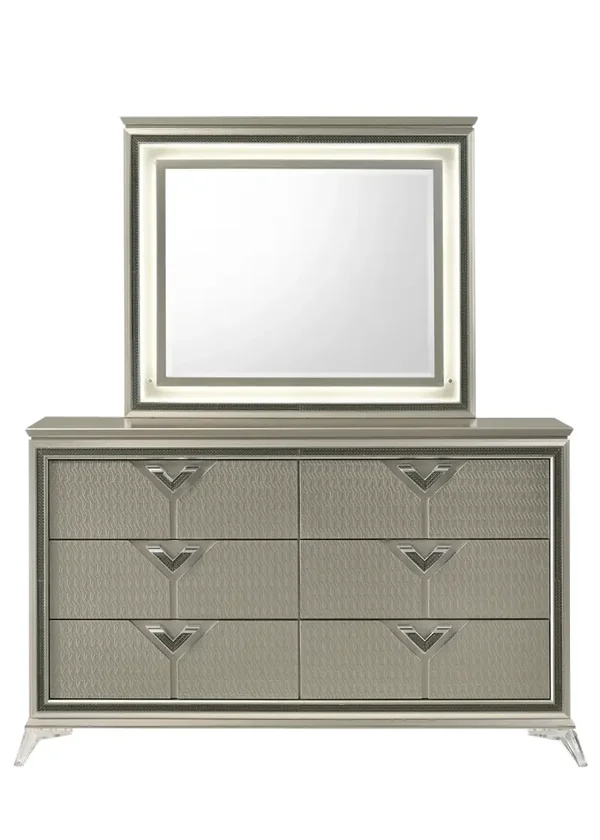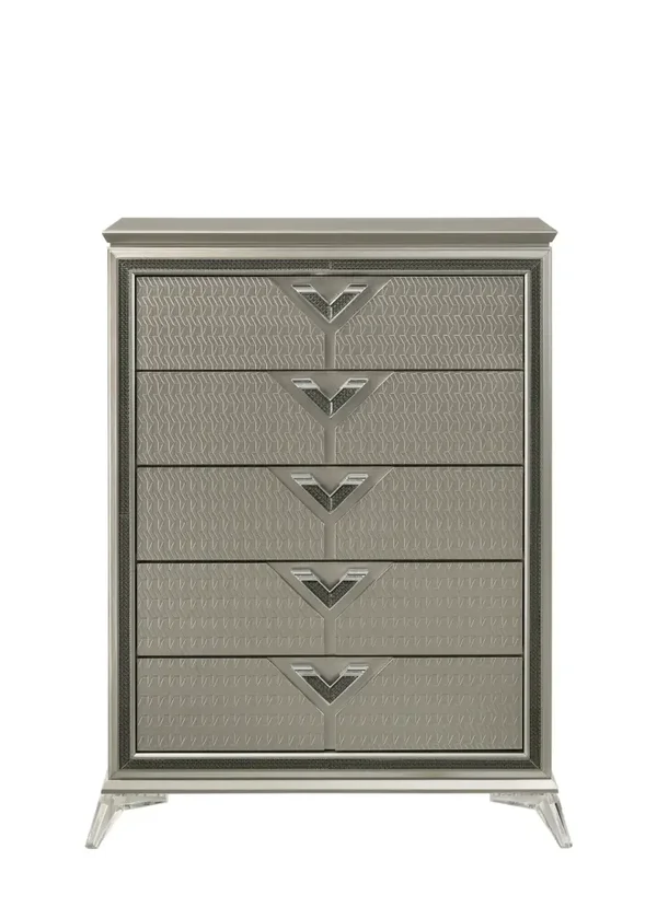 5pcs: Bed, Dresser, Mirror, Nightstand and Chest.